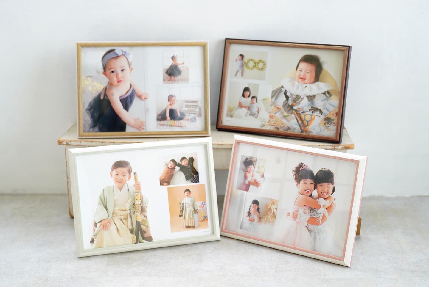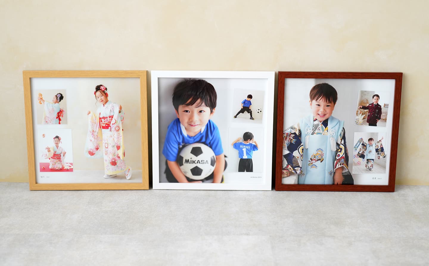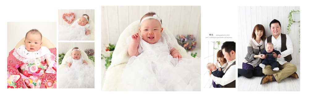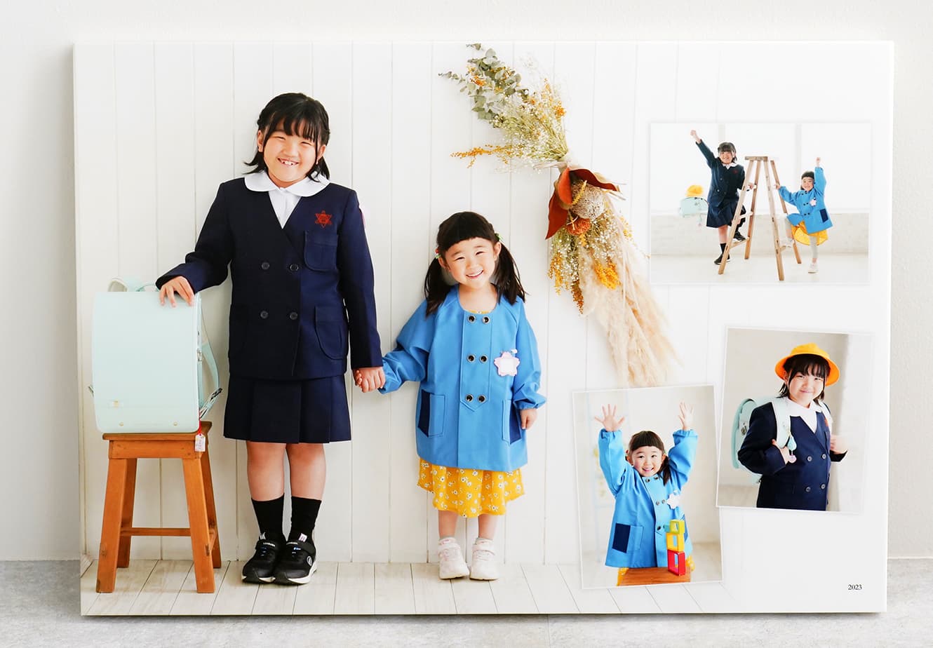 何枚かのお写真をひとつにデザインするタイプは、大きく配置するお写真・小さくするお写真のご希望をお聞きし、細かい配置はおまかせとなります